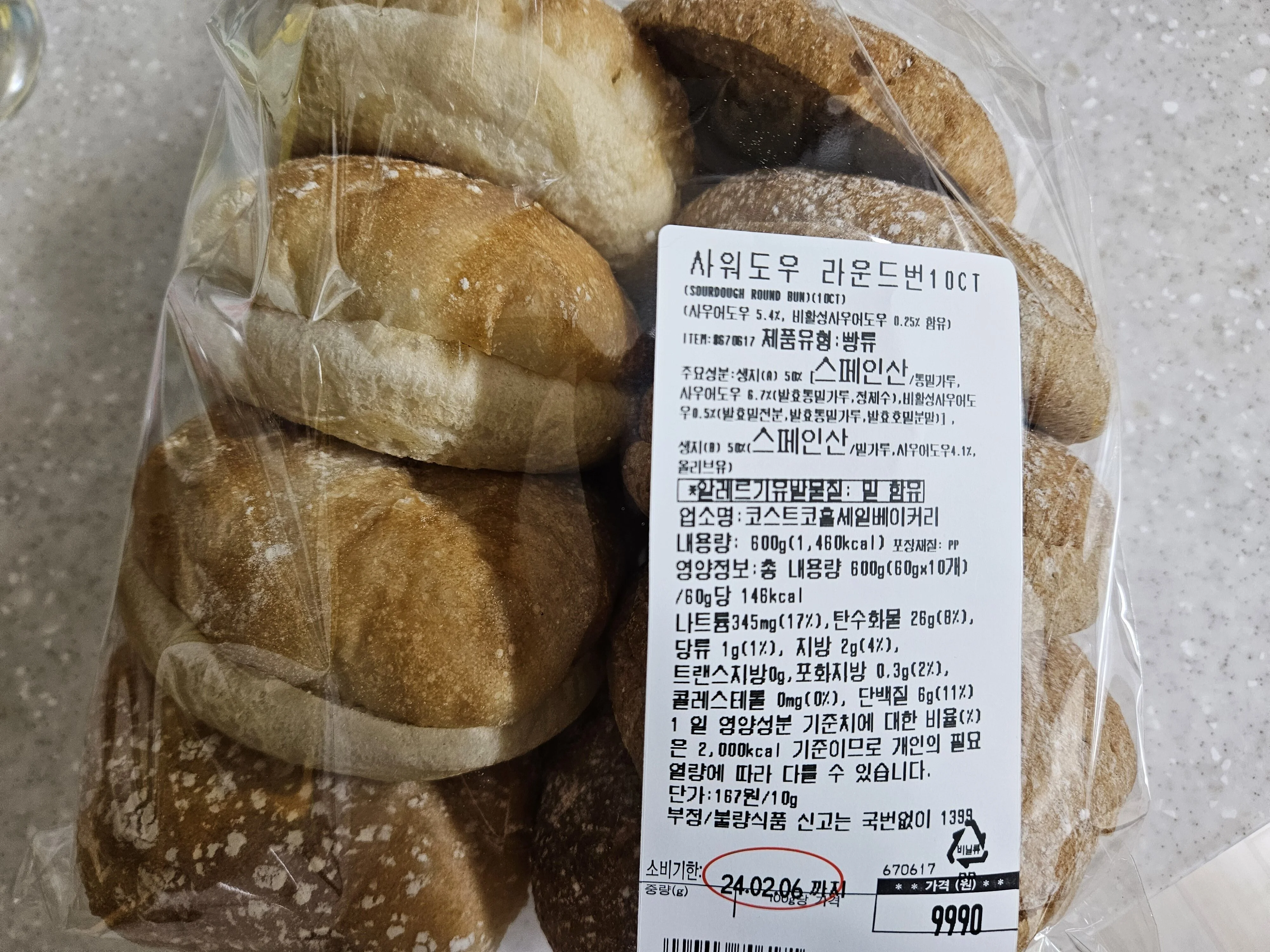 코스트코에는 곡물식빵, 호두식빵이 없어 빵은 집근처 베이커리를 가지만 오늘은 사워도우라운드번을 구입했습니다. 코스트코의 치아바타가 생각보다 딱딱해 이 빵을 선택했는데요. 소비기한이 짧아 냉동실에 넣어두고 하나씩 미니 오븐에 구운 후 저는 치즈, 엄마는 꿀을 살짝 바른 후 포테이토 에그 샐러드를 발라 드실 생각입니다.