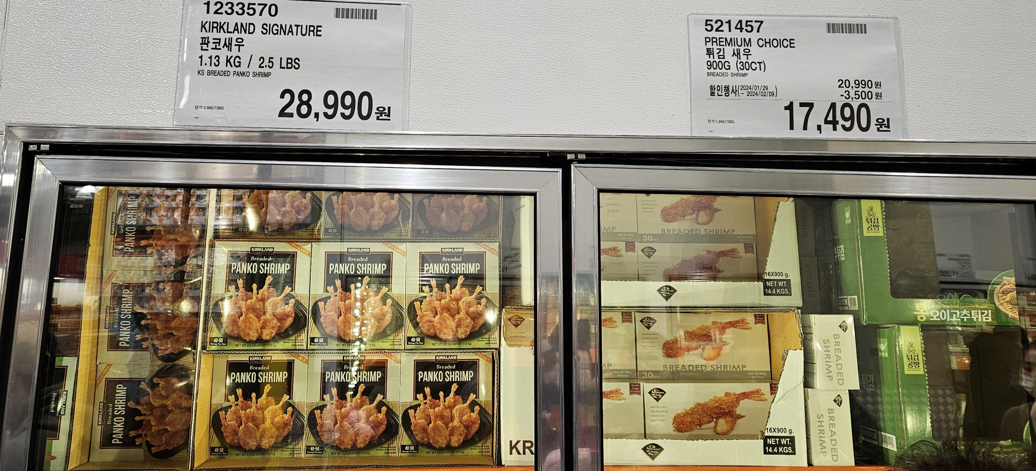 그리고 이번에 두번째로 구입한 판코새우. 평소에 튀김 옷이 두꺼운 걸 싫은데 이 판코새우는 빵가루가 입혀져 맛있습니다. 반찬 없을 때 간식이 먹고 싶을 때에 3개씩 에어프라이에 8분간 돌려 먹으면 과자보다 좋은 간식이죠. 바로 옆에 '튀김새우'가 3500원 할인하지만 흔들리지 않고 판코새우를 찜했습니다.