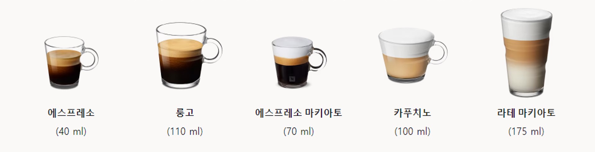 정확하게는 이탈리아 드롱기에서 만든 커피머신입니다. 제조국이 이탈리아이고 고품질 에스프레소 머신을 만드는 드롱기 제품이라니 신뢰도가 확 올라가는데요. 네스프레소의 '라티시마원'과 '그랑 라티시마'는 에스프레소를 비롯한 블랙커피와 우유 베이스인 에스프레소 마키아토, 카푸치노, 라테 마키아토를 버튼 하나로 만드는 기능이 내장되어 있습니다.